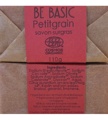 Un Savon fabriqué avec notre mélange "Be Basic" d'huiles biologiques de Karité, coco, d'olive,d'avocat et de ricin. Il est coloré avec un ocre rose. Son parfum profond et terreux provient de l'huile essentielle de petitgrain qui est extraite des feuilles et des brindilles vertes de l'oranger amer.