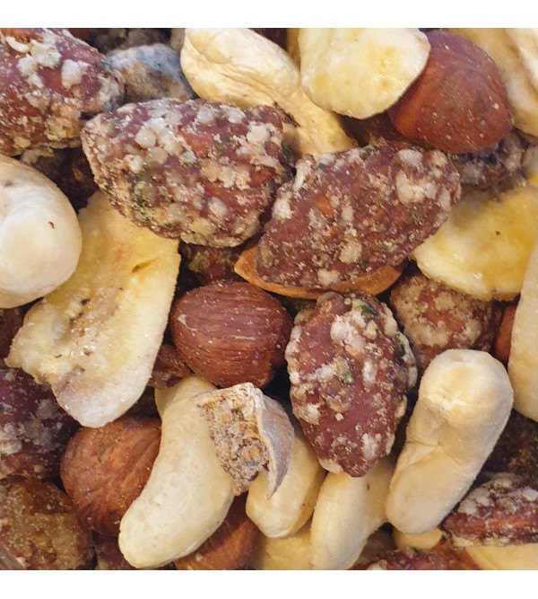 Mélange d'amandes pralinées au chanvre, bananes chips, amandes, noisettes, raisins, figues.